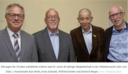 Ehrungen: Für 50 Jahre unfallfreies Fahren wurden Wilfried Dreher aus Friesenheim und Dietrich Berger aus Ottenheim geehrt. Für langjährige Mitgliedschaft in der Verkehrswacht Lahr wurden ausgezeichnet: 50 Jahre: Firma Link, Lahr; Firma Ernst Schmidt Lahr; 40 Jahre: Dietrich Berger, 20 Jahre: Firma Juhela, Andreas Löffler, Johannes Stocker; 10 Jahre: Kurt Reith, Stadt Ettenheim