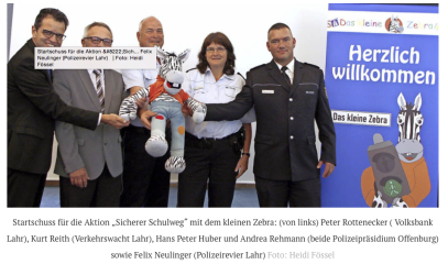 Andrea Rehmann vom Polizeipräsidium Offenburg tourt mit dem Zebra vom 10. bis 14. Oktober in die Schulen und wird mit ihm zirka 700 Kinder spielerisch auf ihrem Schulweg begleiten. Susanne Steudten, zuständig für Prävention im Polizeipräsidium Offenburg, lobte die Zebra-Aktion. Das Kuscheltier nehme die Kinder mit auf eine Reise, sie könnten selbst aktiv werden und das Erlernte gleich anwenden, indem sie dem Zebra die Verkehrsregeln erklären.